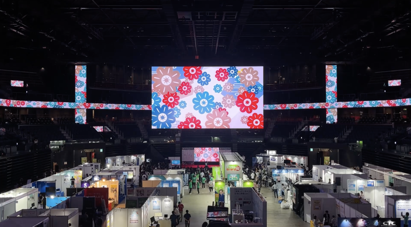 約2,600㎡にも及ぶ広大な展示空間全体を映像でつなぎ、臨場感あふれる空間を実現。それぞれのブースが持つ個性豊かな特長を尊重しつつ、イベントのキービジュアルを巧みに組み込むことで、会場全体に統一感と一体感を生み出すことに成功しました。