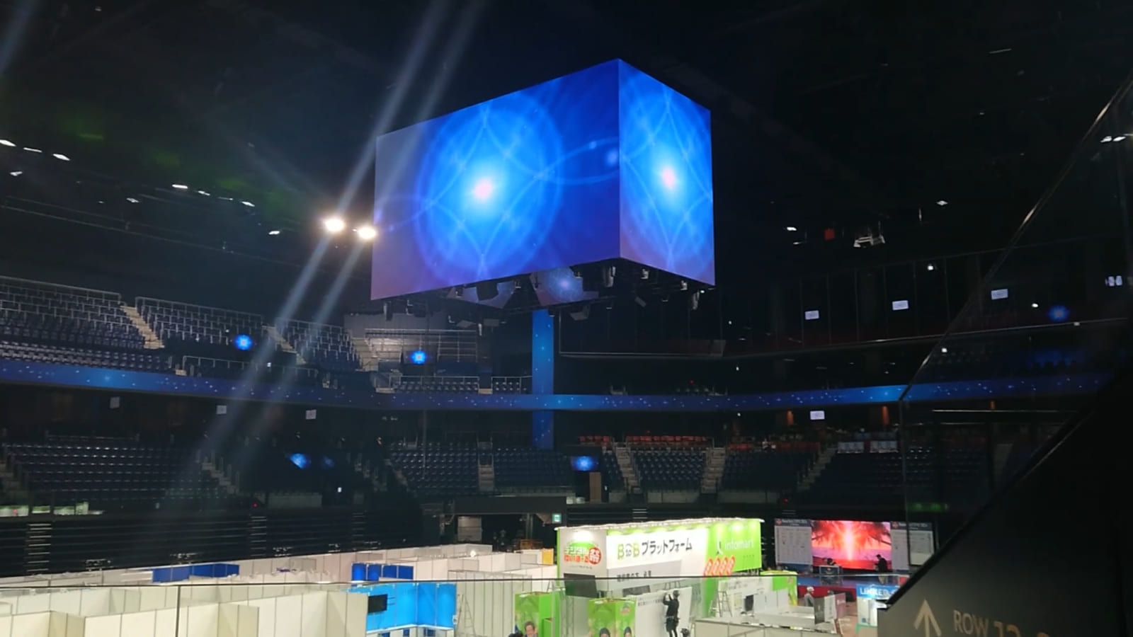 オープニングムービーは館内演出ムービーとしても使用されるという事で、沖縄アリーナ内に設置された多彩なビジョンが完全に連動するよう、細部まで設計を練り上げています。会場中央にそびえる510インチのメガビジョンや、展示会場を囲む360°リボンビジョンなど、圧倒的なスケールで来場者の目を奪いました。